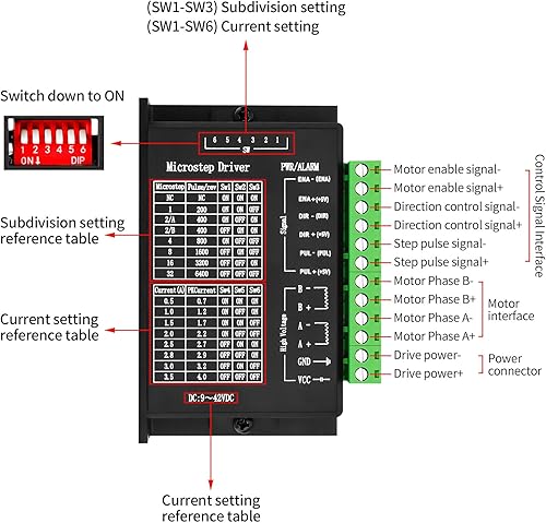 Le moteur pas à pas basé sur le système TB6600 vous permet de contrôler le moteur avec une consommation de courant jusqu’à 4 A (la plage est réglable de 0,2 A à 4 A) sur la bobine avec une tension de 9 V à 42 V. Il dispose de six modes de contrôle: à pas complet, non circulaire 1/2, 1/2, 1/4, 1/8 et 1/16. 391/5000 spécification Tension d’alimentation: de 9 V à 42 V Courant continu sur la bobine: réglable de 0,2 A à 4 A Entrées optiquement isolées Protections: De trop haute tension De sous-tension De trop de courant De court circuit Résolution: 1, pas circulaire 1/2, 1/2, 1/4, 1/8 et 1/16 Température de travail: de -10 ° C à 45 ° C Dimensions: 116 x 86 x 33 mm (avec connecteurs) Poids: 220 g